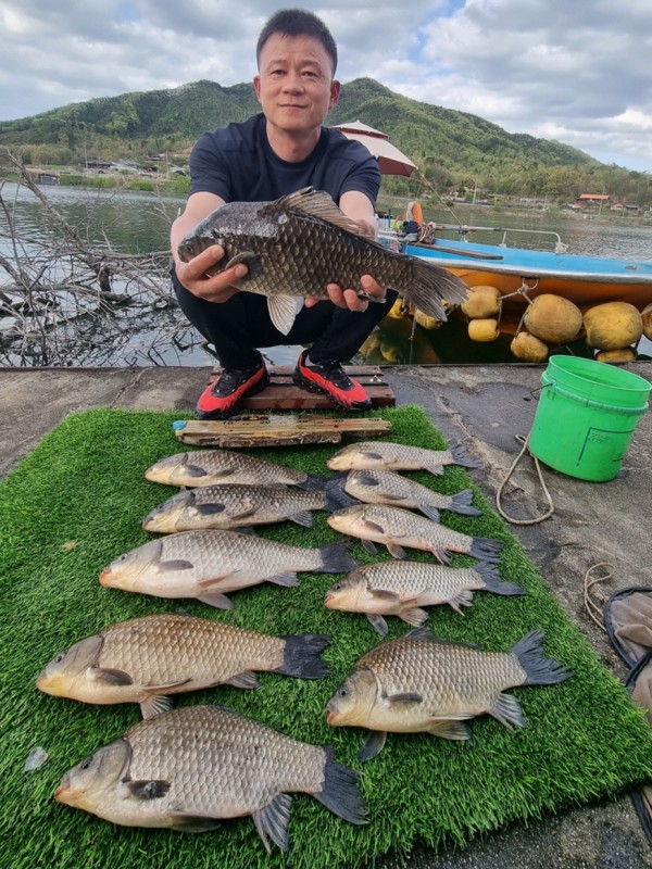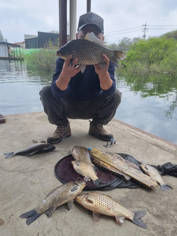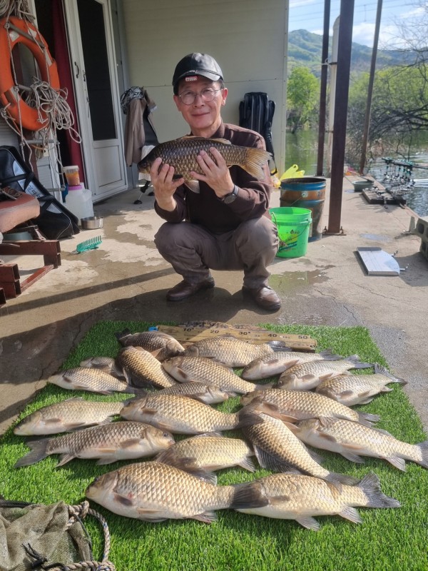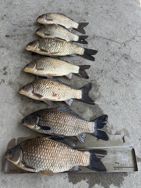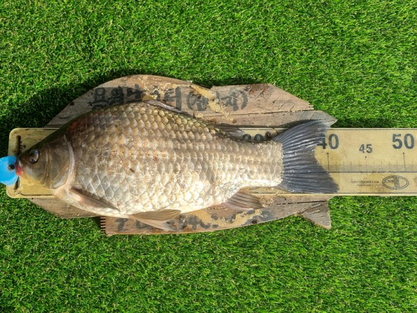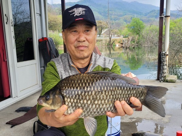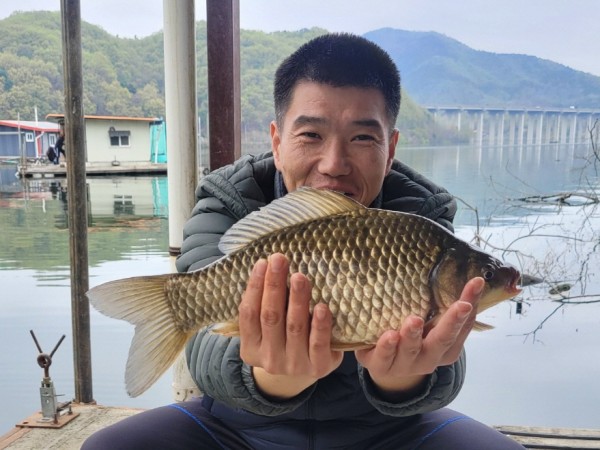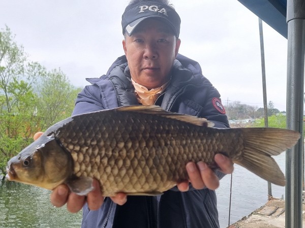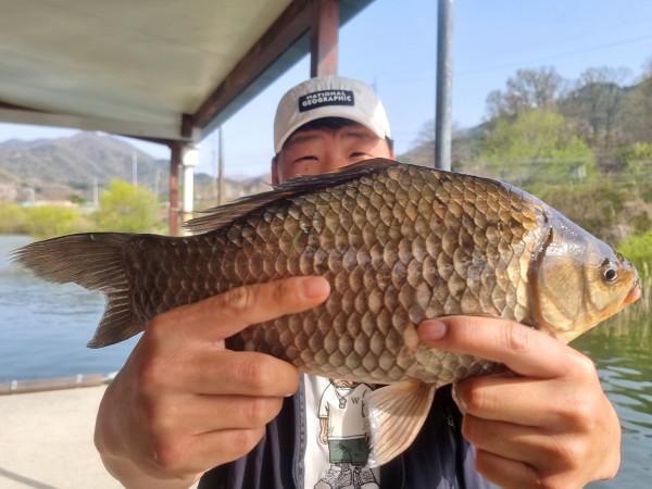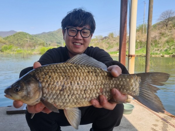 반가운 붕어 손님이 밖으로 다시 나와 얼굴을 보여주어